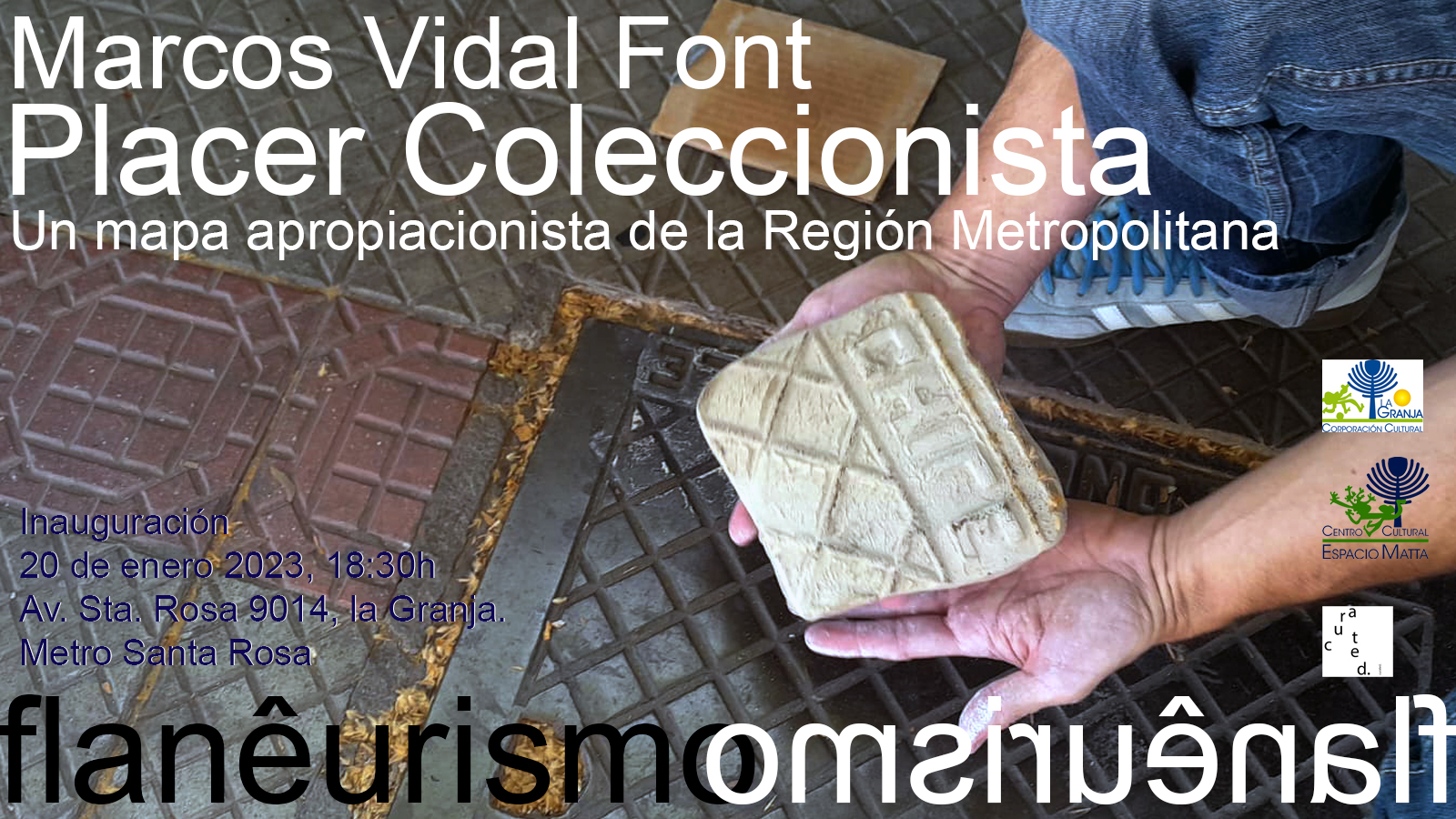 Este proyecto y exposición del artista Marcos Vidal Font, comisariado por Patricio Álvarez Aragón, en el CCEM, Centro Cultural Espacio Matta o Espacio Matta, llamado "Placer coleccionista. Mapa apropiacionista de la Región Metropolitana" (20 de enero - 6 de marzo de 2023). El CCEM es el espacio museístico de mayor relevancia del sector sur de Santiago de Chile con respecto a presentación y proyección de artistas contemporáneos locales e internacionales y dónde se conserva el mural, ahora Monumento Nacional "El primer gol del pueblo chileno" realizado por el artista universal Roberto Matta Echaurren que en colaboración con la Brigada Ramona Parra en el año 1971.